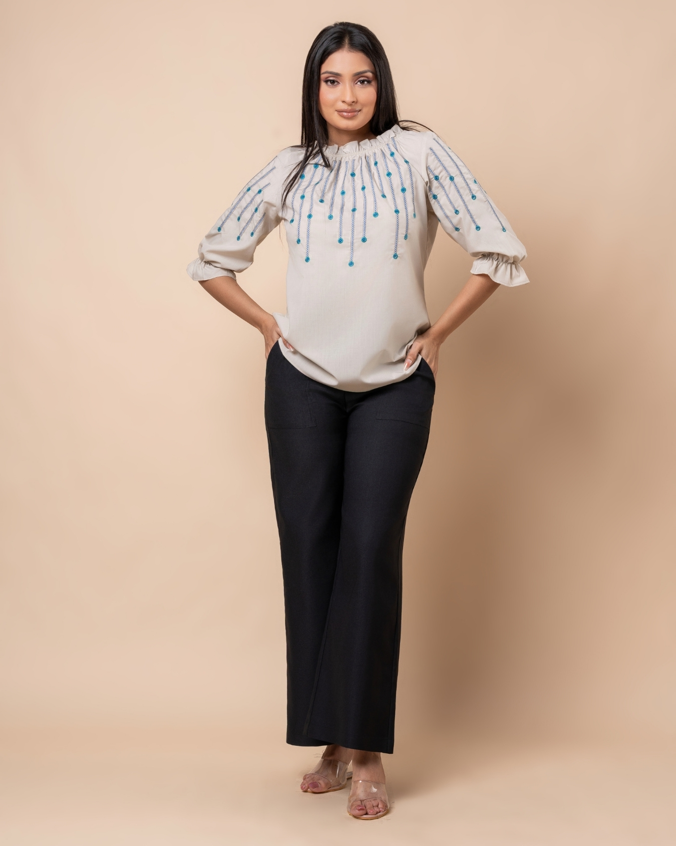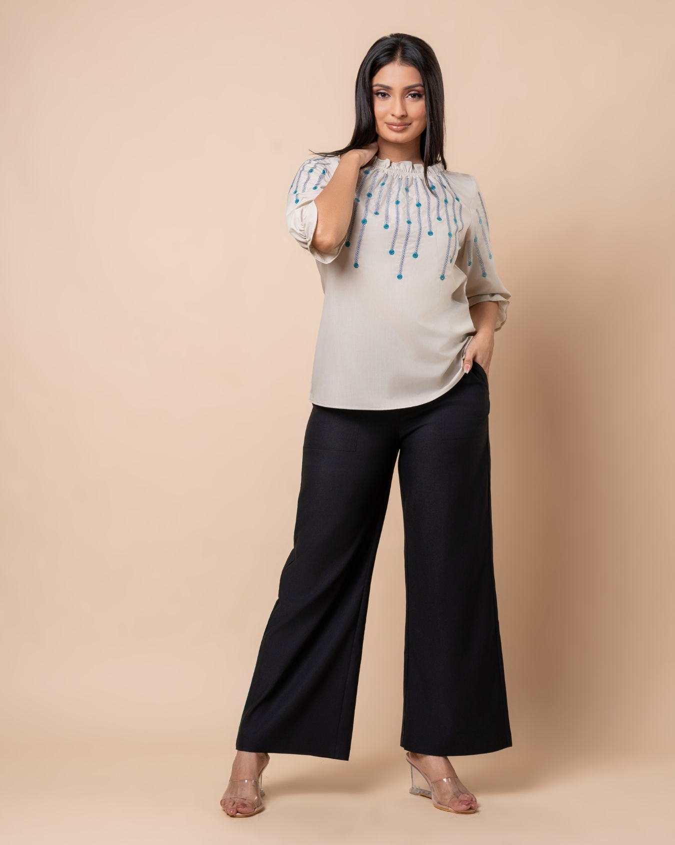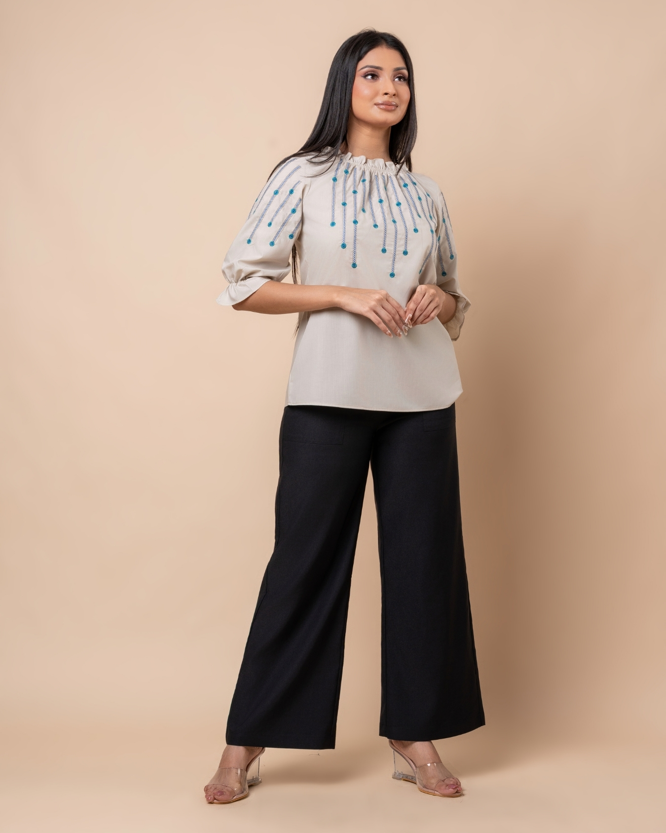 Embroidered Frilled Neck Puff Sleeve Top