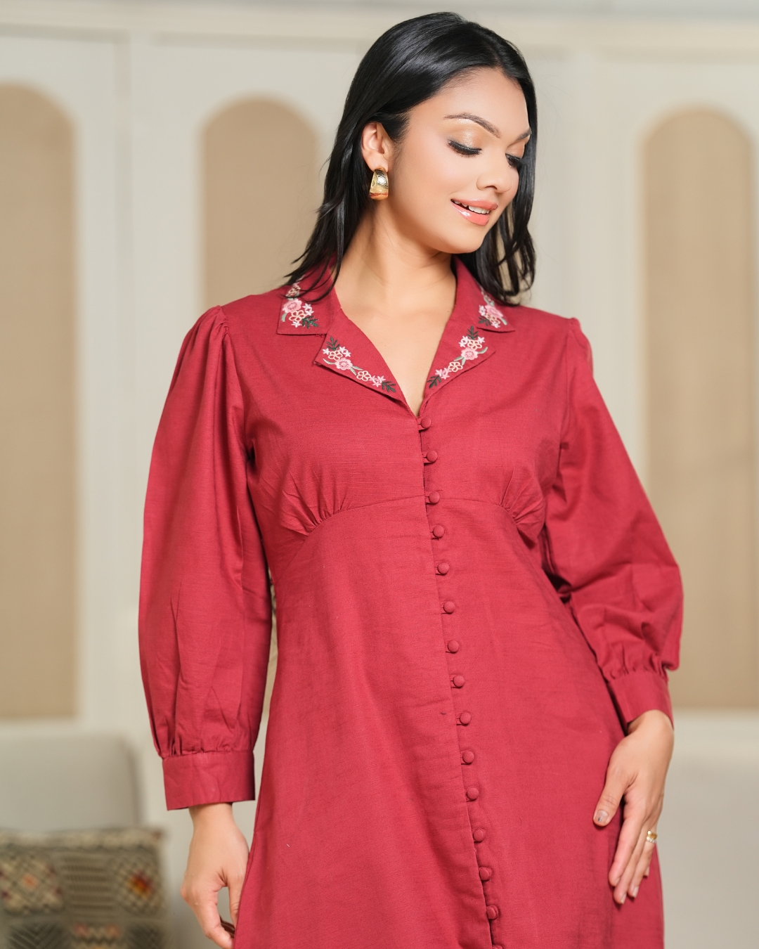 Embroidered Lapel Collar Midi Dress