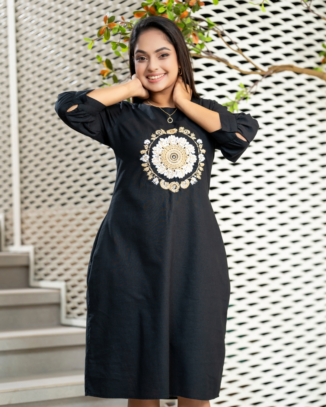 Mandala Embellished Round Neckline Short Dress